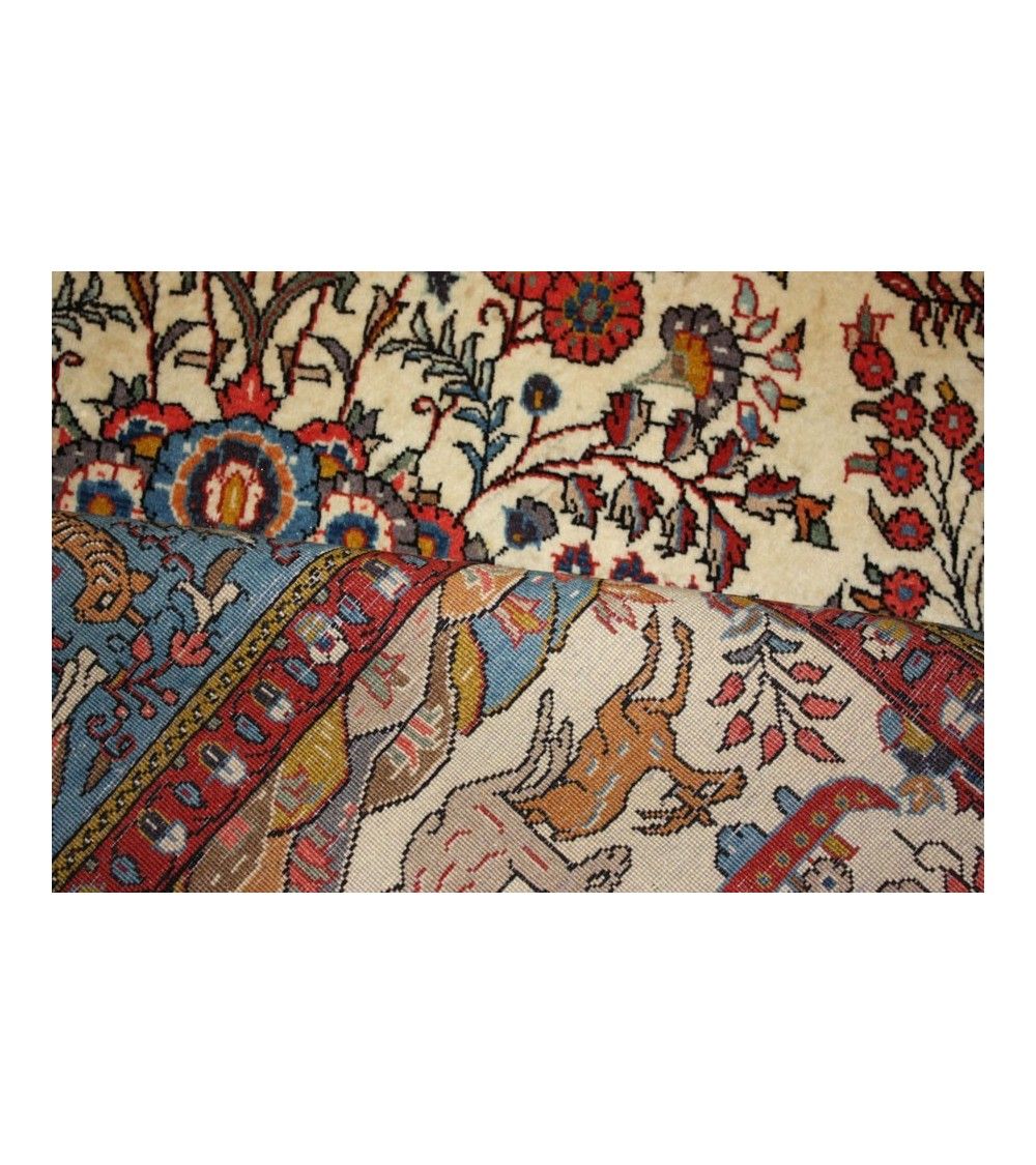 C’est plutôt la technique de travail qui aide à l’identification du Ghom: elle est de haute qualité, aux nouages réguliers, ce qui donne un tissu très compact et durable. Les tapis Ghom sont, pour la plupart en soie. Toutes les couleurs sont d’origines végétales.